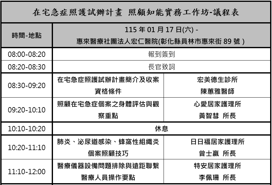 培訓地點:惠來醫療社團法人宏仁醫院(彰化縣員林市惠來街89號)